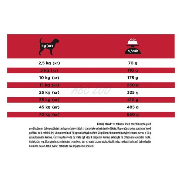 Аналитични съставки: протеин 26,5 %, мазнини 15 %, пепел 7,5 %, фибри 4,5 %, Таурин: 0,2 %, Метонин: 1,4 %, Омега-3 мастни киселини (EPA + DHA): 0,7 %, Натрий: 0,18 %, Магнезий: 0,15 %, Калий: 0,6 %