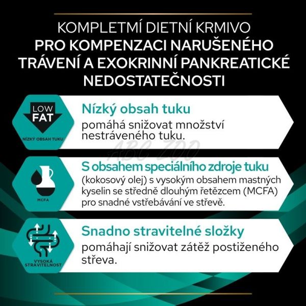 Purina Veterinary Diets е пълноценна, високо смилаема храна с ниско съдържание на фибри за кученца и възрастни кучета, предназначена за компенсиране на храносмилателни нарушения и екзокринна панкреатична недостатъчност.