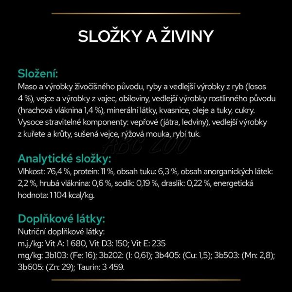 Състав: Месо и странични животински продукти, Риби и странични рибни продукти (4 % сьомга), Яйца и странични продукти от яйца, Зърнени храни, Минерални вещества, Странични растителни продукти (грахово влакно 1,4 %), Масла и мазнини, мая, захари