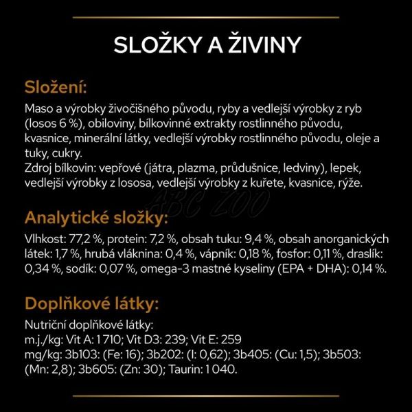 Състав: Месо и странични животински продукти, Риби и странични рибни продукти (6 % сьомга), Зърнени храни, Растителни протеинови концентрати, Дрожди, Минерални вещества, Странични растителни продукти, Мазнини и масла, Захари