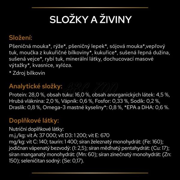 Състав: Пшенично брашно*, Ориз*, Пшеничен глутен*, Соево брашно*, Свинска мазнина, Брашно от царевично протеин*, Царевица*, Сушена цвеклова пулпа, Сушени яйца*, Рибено масло, Минерални вещества, Ароматизатор*, Дрожди, Ксилоза