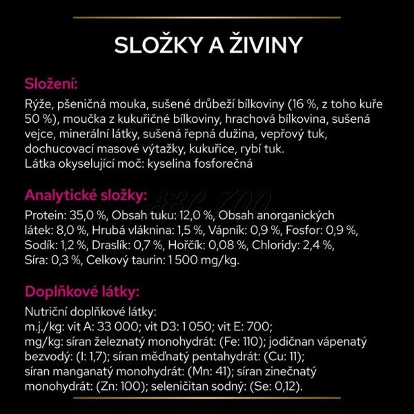 Състав: Ориз, Пшенично брашно, Сушени пилешки протеини (16 %, от които 50 % пиле), Брашно от царевичен протеин, Грахов протеин, Сушени яйца, Минерални вещества, Сушена цвеклова пулпа, Свинска мазнина, Ароматизатор, Царевица, Рибено масло, Вещество, подкисляващо урината: фосфорна киселина