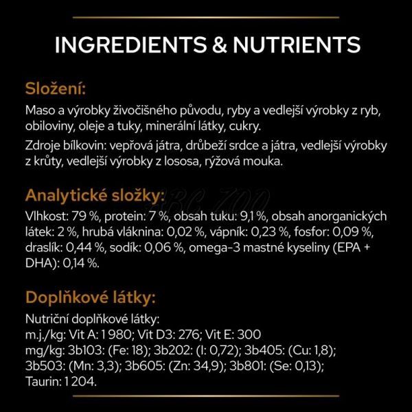 Източници на протеини: Свинска черен дроб, Пилешко сърце и черен дроб, Странични продукти от пуйка, Странични продукти от сьомга, Оризово брашно