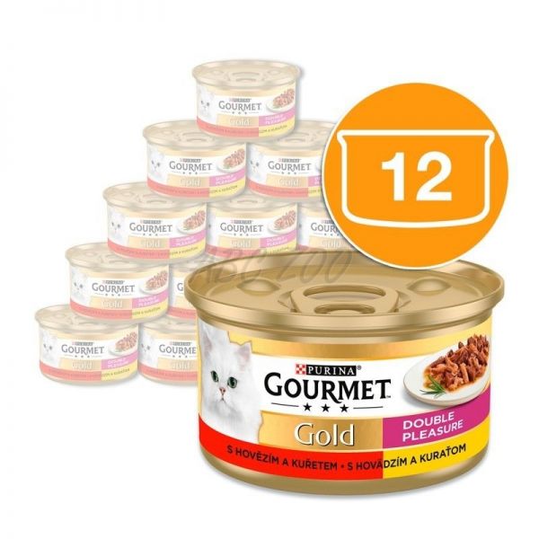 Консерва Gourmet GOLD - гриловани и задушени парчета месо с говеждо и пиле, 12 x 85г