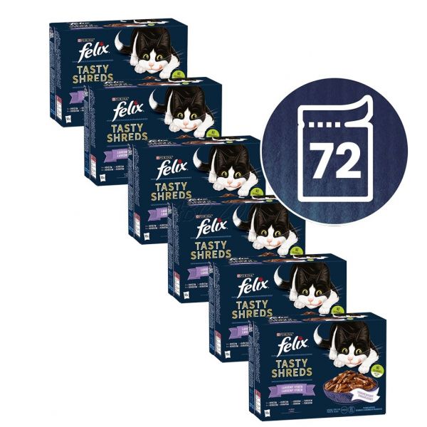 Консерви за възрастни котки Felix с деликатно месо в сос - пиле, говеждо, сьомга, риба тон, под формата на накъсани парчета.
