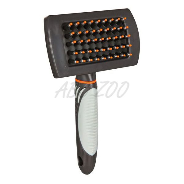 Четката TRIXIE за разресване на козината на котки и кучета с пластмасови зъбци, завършващи с топчета. Четката е изработена от пластмаса и гума в черно-сиви цветове с оранжеви детайли.