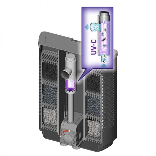 IF 400 + UV е иновативен вътрешен филтър, който се отличава със своята многостранност и приложимост. Подходящ е за сладководни и морски аквариуми и позволява засмукване на вода от повърхността или отстрани на аквариума. Оснащен е с регулируема филтрационна помпа FP 750 и UV-C единица, която осигурява унищожаване на микроорганизми, паразити и водорасли. Филтърът разполага с 6 филтрационни кошници, които позволяват лесно подреждане и смяна на филтрационните медии. Кошниците могат лесно да се изваждат нагоре с помощта на дръжка.